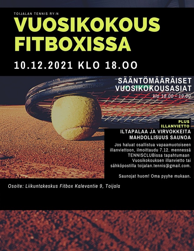 Tervetuloa Toijalan Tennis ry:n vuosikokoukseen 10.12. klo 18, paikka Liikuntakeskus Fitbox Toijalassa. Sääntömääräisen vuosikokouksen jälkeen on mahdollisuus jäädä viettämään klubi-iltaa iltapalan, virvokkeiden, saunomisen ja seurustelun merkeissä. Ilmoittautumiset illanviettoon 7.12. mennessä TennisClubin kautta tapahtumaan "Vuosikokouksen illanvietto" tai sähköpostilla toijalan.tennis@gmail.com.