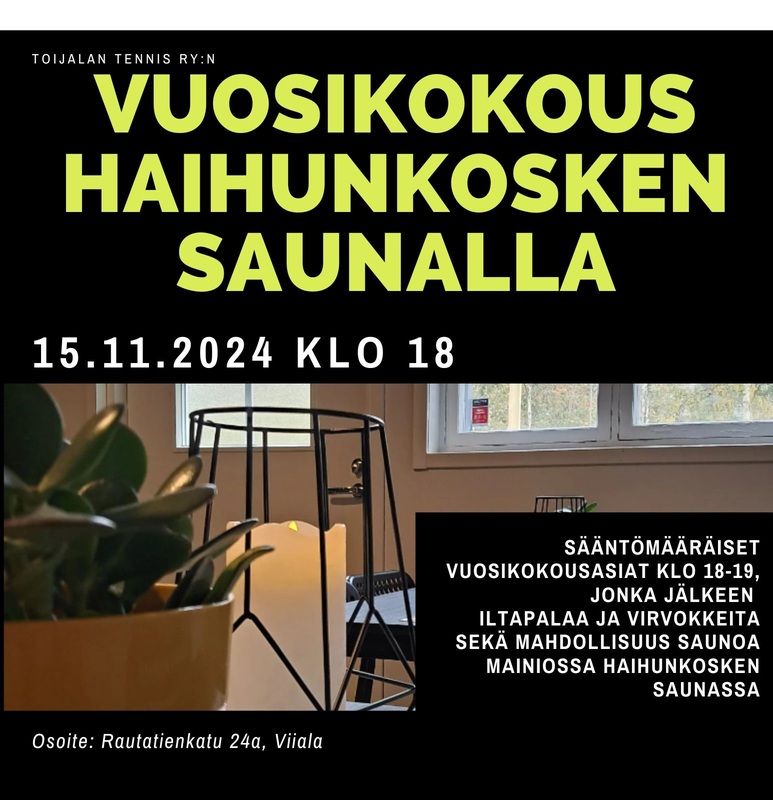 Toijalan Tenniksen vuosikokous järjestetään 15.11. klo 18 alkaen Haihunkosken Saunalla Vuosikokousasiat käsitellään klo 18-19, tarjolla on iltapalaa ja virvokkeita. Kokouksen jälkeen mahdollista saunoa Haihunkosken mainoissa saunassa. Linkki ilmoittautumislomakkeeseen tässä Tervetuloa! |